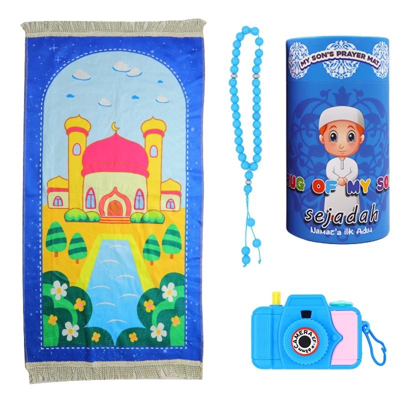 اجمل هدية اطفال في رمضان لتشجيعهم على تعلم الصلاه ، طقم صلاة عباره عن اسطوانه تحتوي على سجادة صلاه من القماش الخفيف بقياس 50 سم في 90 سم ، مع مسبحة اطفال و مجسم على شكل كاميرا بداخلها شريط صور ضوئي ، كما يمكن للاطفال استخدام علبة الاسطوانه كحصاله ، تتوفر للاولاد باللون الازرق و للبنات باللون الوردي .